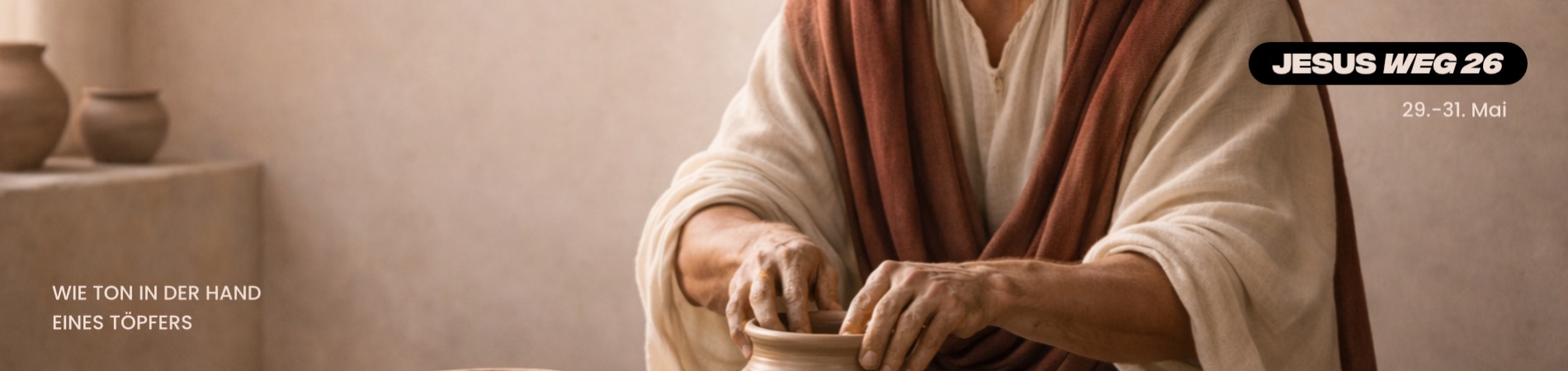 „Wie Ton in der Hand eines Töpfers“ – das ist das Motto der Jesus Weg 26 Konferenz. Wir laden dich ein, tiefer in die Nachfolge Jesu einzutauchen und seinen Weg auf eine persönliche und transformative Weise zu erleben. Unser Herzenschrei ist es so nahe an Jesus bleiben, dass sein Wesen unser Leben formt. Von meditativer Stille über leidenschaftliche Anbetungsmusik bis hin zu geführtem Gebet – die Jesus Weg 26 bietet eine Bandbreite an Ausdrucksformen und schafft Raum für tiefes geistliches Wachstum und Erneuerung.