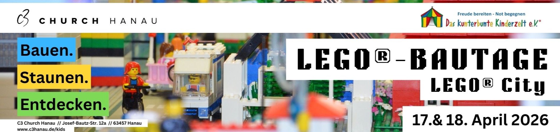 Die LEGO®-Bautage werden veranstaltet von der C3 Hanau in Kooperation mit Das kunterbunte Kinderzelt e.V. und richten sich an Kinder – unabhängig von einer Gemeindezugehörigkeit.