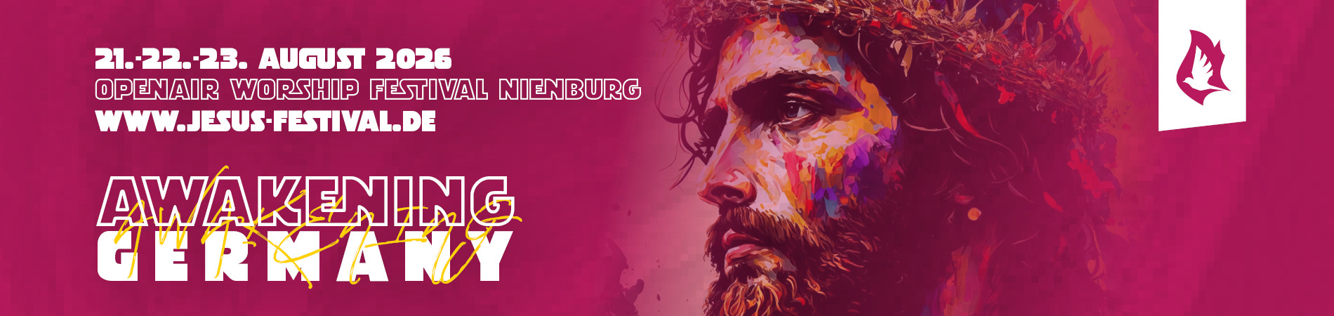 21.+22.+23. August 2026 in Norddeutschland. Location ist auf der Festwiese in Nienburg/Weser, zwischen Bremen und Hannover. Es dreht sich alles um Jesus Christus. Er steht im Mittelpunkt. Wir wollen ihn mit Lobpreis und Anbetung alle Ehre geben und seine Herrlichkeit und Gegenwart erleben!