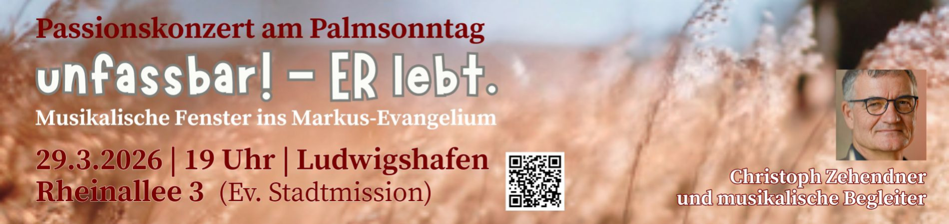 Erlebe die letzten Tage Jesu in Texten, Liedern und Instrumentalmusik. Christoph Zehendner und seine musikalischen Begleiter führen einfühlsam durch Passion, Tod und Auferstehung – lebendig, berührend und voller Hoffnung. Ein Abend zum Zuhören, Nachdenken und Mitsingen – als Vorbereitung auf das Wunder von Ostern.