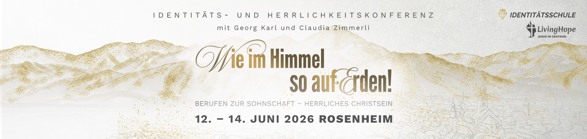 Bei der Identitäts- und Herrlichkeitskonferenz 2026 kommen wir zusammen, um in die Gegenwart Gottes einzutauchen und der Kraft des Heiligen Geistes Raum zu geben. Als gläubige Christen sind wir Söhne und Töchter Gottes und als solche auch Erben seiner Herrlichkeit. Durch das vollbrachte Werk von Jesus Christus ist für uns alles getan worden, was wir für ein Leben in göttlicher Fülle brauchen. Durch den Austausch am Kreuz sind uns alle Sünden vergeben, wir haben göttliche Natur und sind vollkommen gerecht vor Gott. Sein Opfer hat uns Freiheit, Gnade und direkten Zugang zu einem neuen Leben geschenkt.