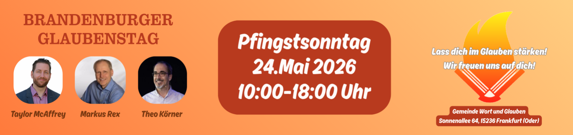Markus Rex ist seit mehr als 35 Jahren Pastor der Gemeinde Wort und Glauben in Frankfurt (Oder), die er zusammen mit seiner Frau Ilka gründete. Neben seiner Tätigkeit als Pastor ist er als Bibellehrer für das Rhema Bible Training Center unterwegs und wird von verschiedenen Gemeinden gern als Sprecher eingeladen. Er ist Gastgeber der Konferenz.
